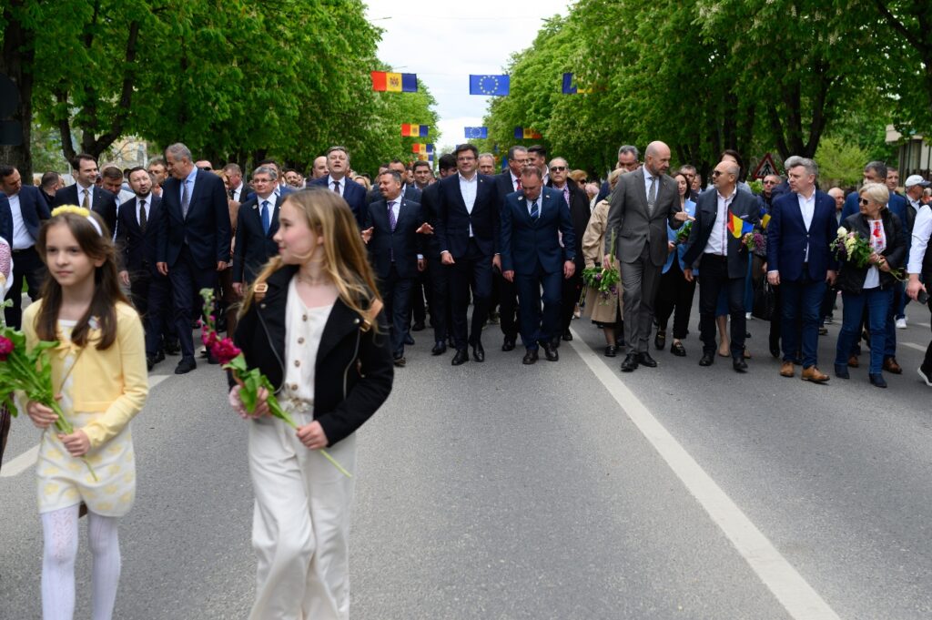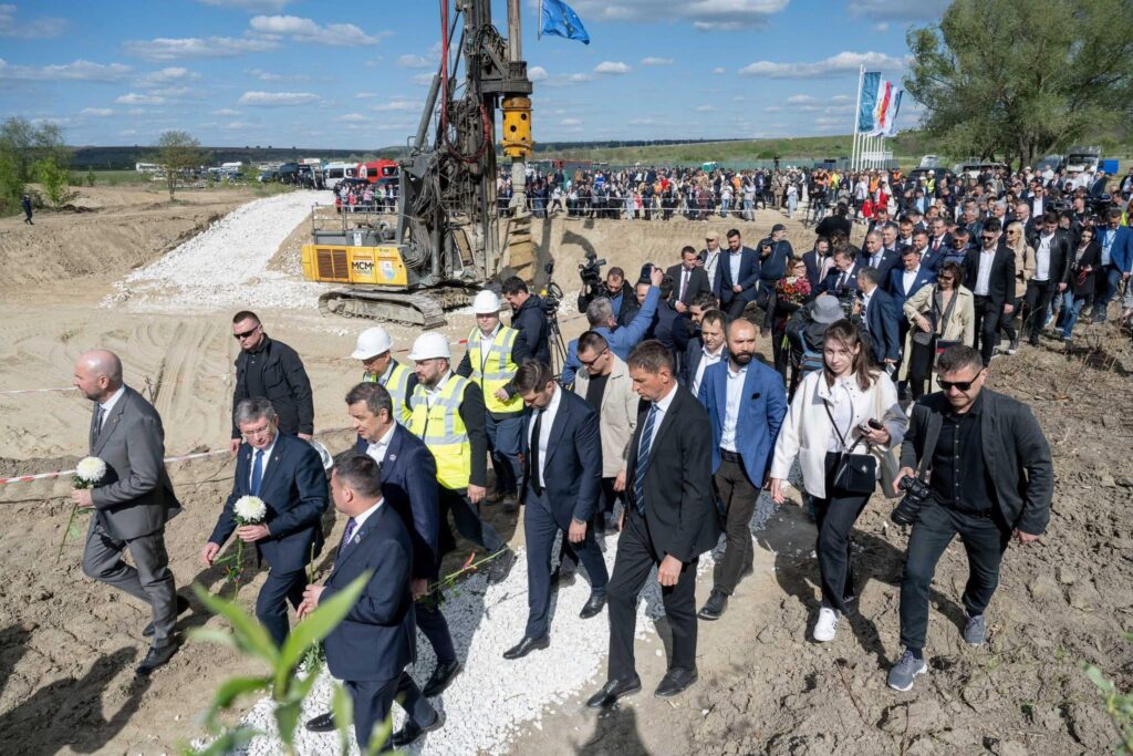 Demararea lucrărilor la pod a fost marcată simbolic atât prin 𝗙𝗲𝘀𝘁𝗶𝘃𝗮𝗹𝘂𝗹𝗣𝗼𝗱𝘂𝗹 𝗱𝗲 𝗙𝗹𝗼𝗿𝗶“, organizat la Ungheni, în Republica Moldova, cât și printr-un spectacol aerian al Șoimilor României.