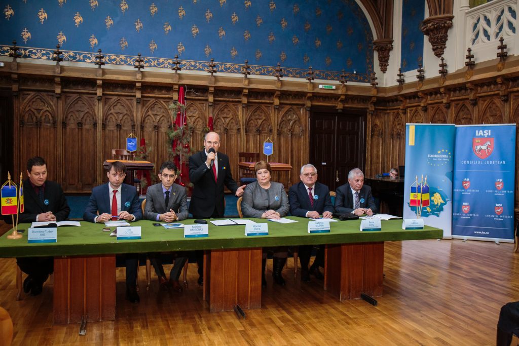 | Scurtă descriere: | În data de 14 decembrie a avut loc semnarea acordurilor de cooperare între 16 primării din raionul Ungheni, Republica Moldova și 16 primării din județul Iași, România. Evenimentul s-a desfășurat în Sala „Henri Coandă”, Palatul Culturii Iași, și reprezintă noi perspective de colaborare pe toate dimensiunile: administrative, economic, cultural. |
